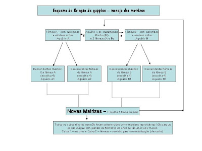 O esquema acima traz uma sugestão de cruzamentos entre matrizes e descendentes, afim de que se obtenha um produto final (peixe) que conserve as melhores carcterísticas da espécie. Obviamente existem muitos outros sistemas de cruzamento visando uma melhor selecção genética utilizado por criadores profissionais. Clik na foto para ampliar.